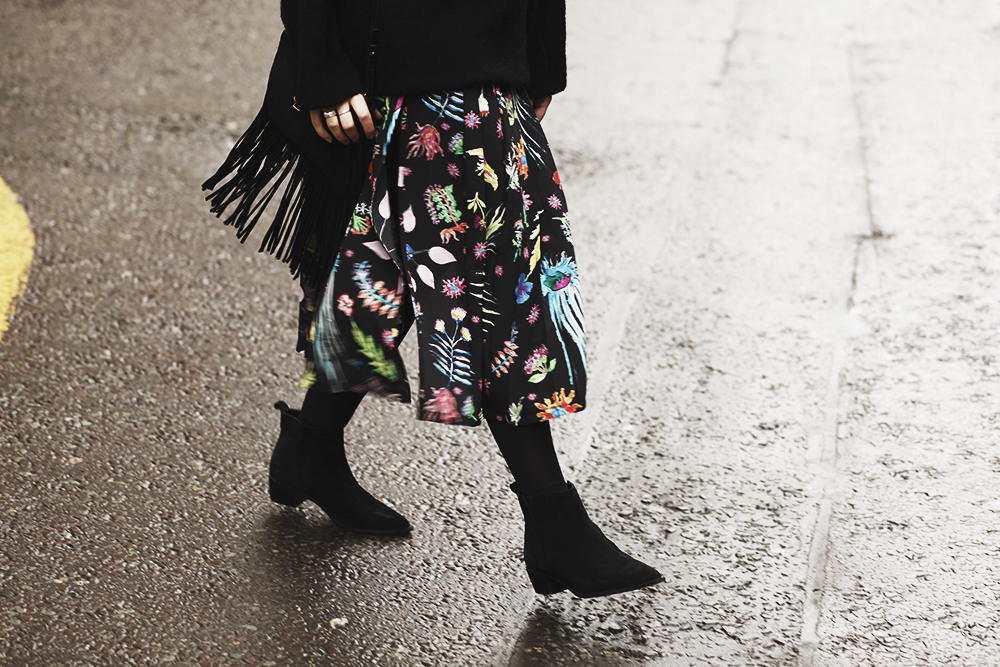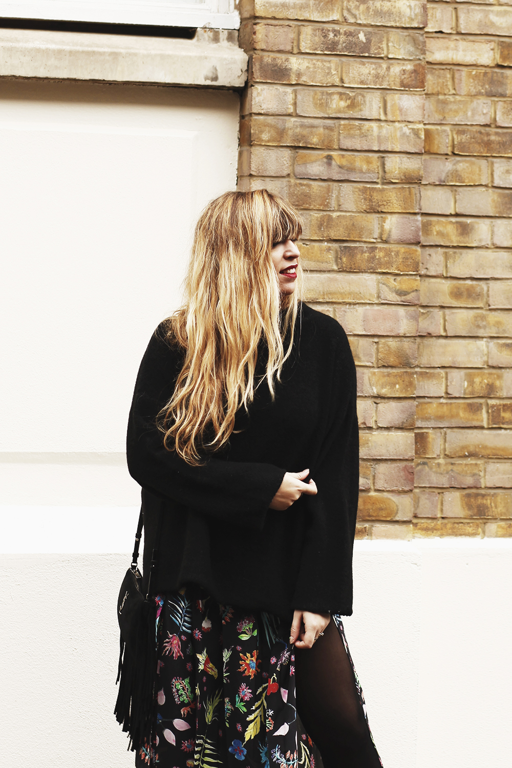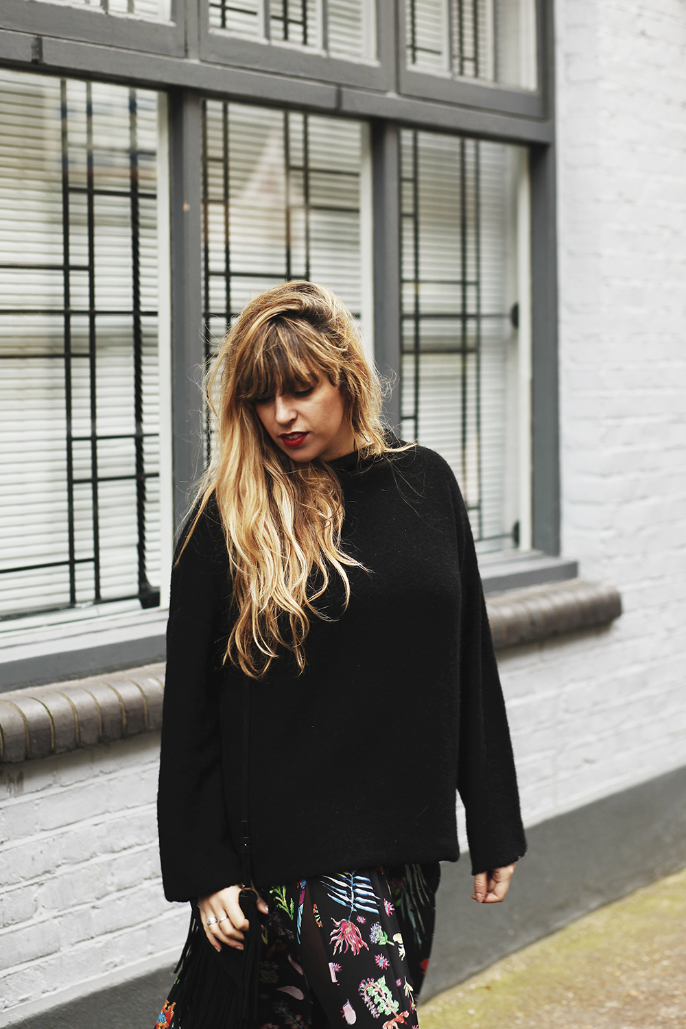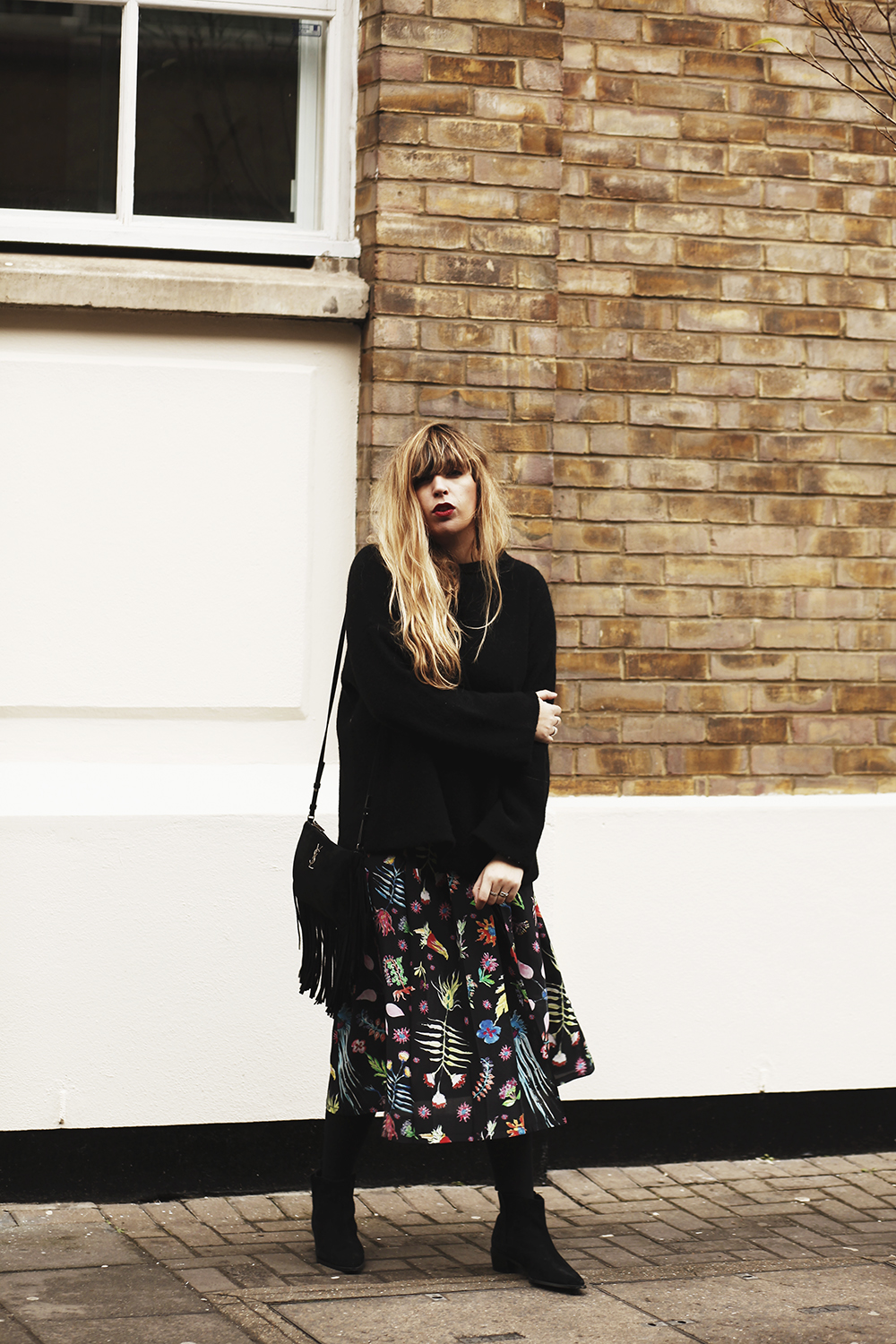 Sweater – Baserange via Gang of Earlybirds / Skirt – Rixo London via Gang of Earlybirds / Bag – Saint Laurent via LuisaViaRoma / Boots – ASOS